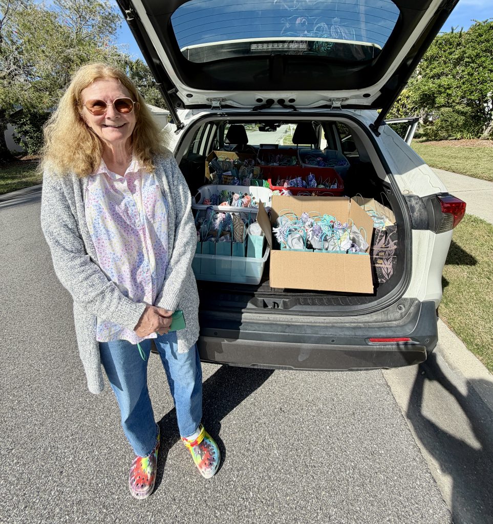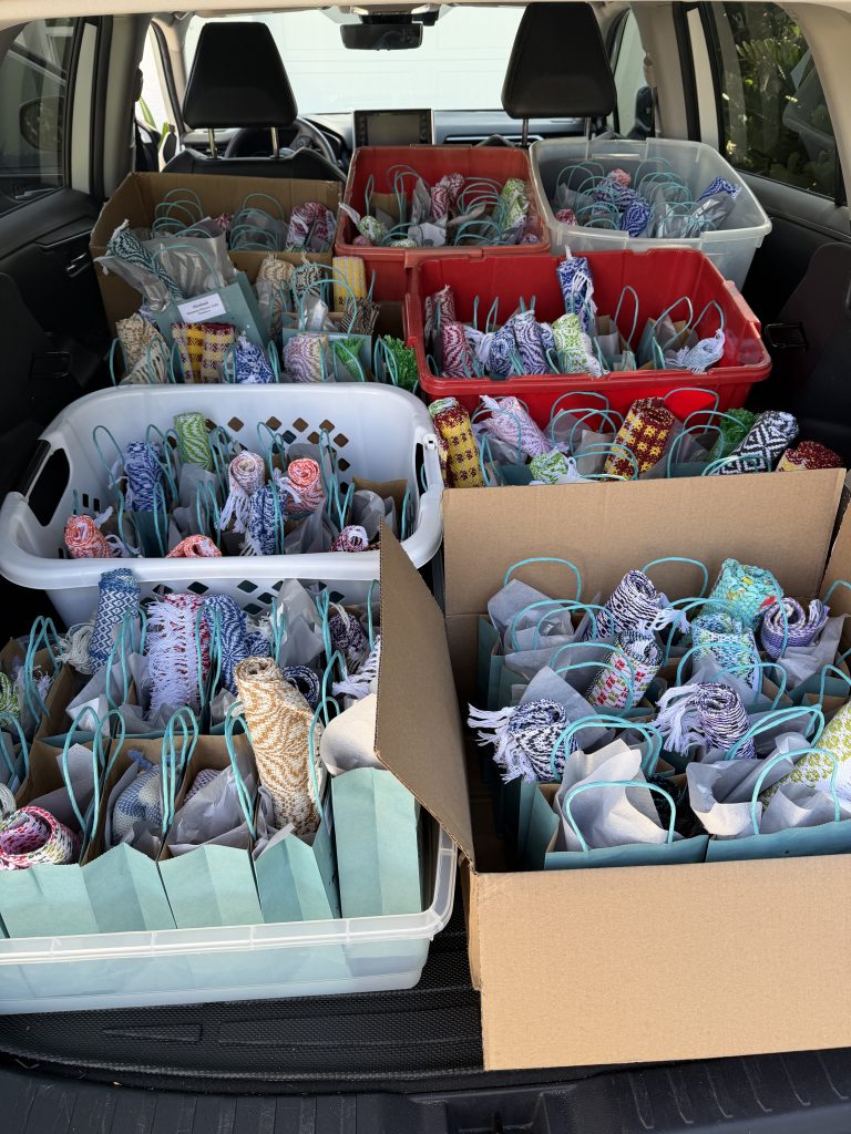 All of the mats festively packaged and ready to go, then loaded into the car! Thanks to all of our members who contributed to the project and especially to Ruth, our star performer!